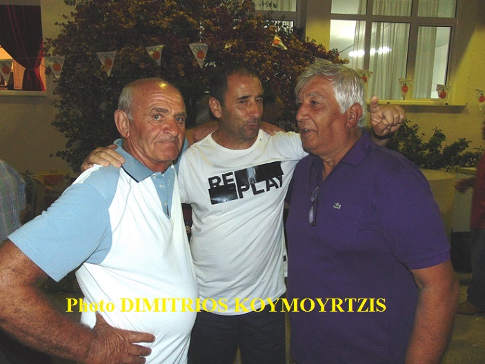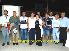 | Ο Χάρης Κοπιτσής παίρνει αναμνηστική πλακέτα από τον Παναγιώτη Λυμπέρη και τον Παναγιώτη Φιφλή |