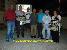 | Ο Χάρης Κοπιτσής παίρνει αναμνηστική πλακέτα από τον Παναγιώτη Λυμπέρη και τον Παναγιώτη Φιφλή |