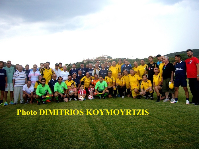 | Οι ομάδες παλαιμάχων του Δήμου Ευρώτα και της ΑΕΚ πριν τον αγώνα |