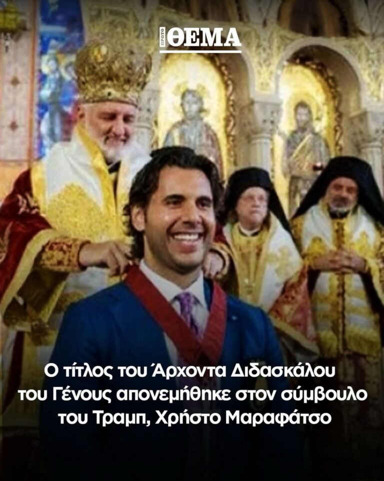 Σε ‘Αρχοντα του Οικουμενικού Πατριαρχείου χειροθέτησε στις Ηνωμένες Πολιτείες Αμερικής ο Αρχιεπίσκοπος Αμερικής Ελπιδοφόρος τον Ελληνοαμερικανό επιχειρηματία, σύμβουλο του Προέδρου Ντόναντ Τραμπ, ιδρυτή του οργανισμού Greeks for Tramp και στενό συνεργάτη της πρέσβεως των ΗΠΑ στην Αθήνα, Κίμπερλι Γκιλφόιλ, Χρήστο Μαραφάτσο. Στον κύριο Μαραφάτσο απονεμήθηκε από τον Οικουμενικό Πατριάρχη Βαρθολομαίο ο τίτλος με τη διάκριση του Διδασκάλου του Γένους.